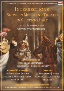 Intersections: Music and Theatre in Seicento Italy This two-day conference, exploring the connections between theatre and music in seventeenth-century Italy, will be held on Thursday 20th September and Friday 21st September 2018 in the Conference Room SR24 of the Faculty of